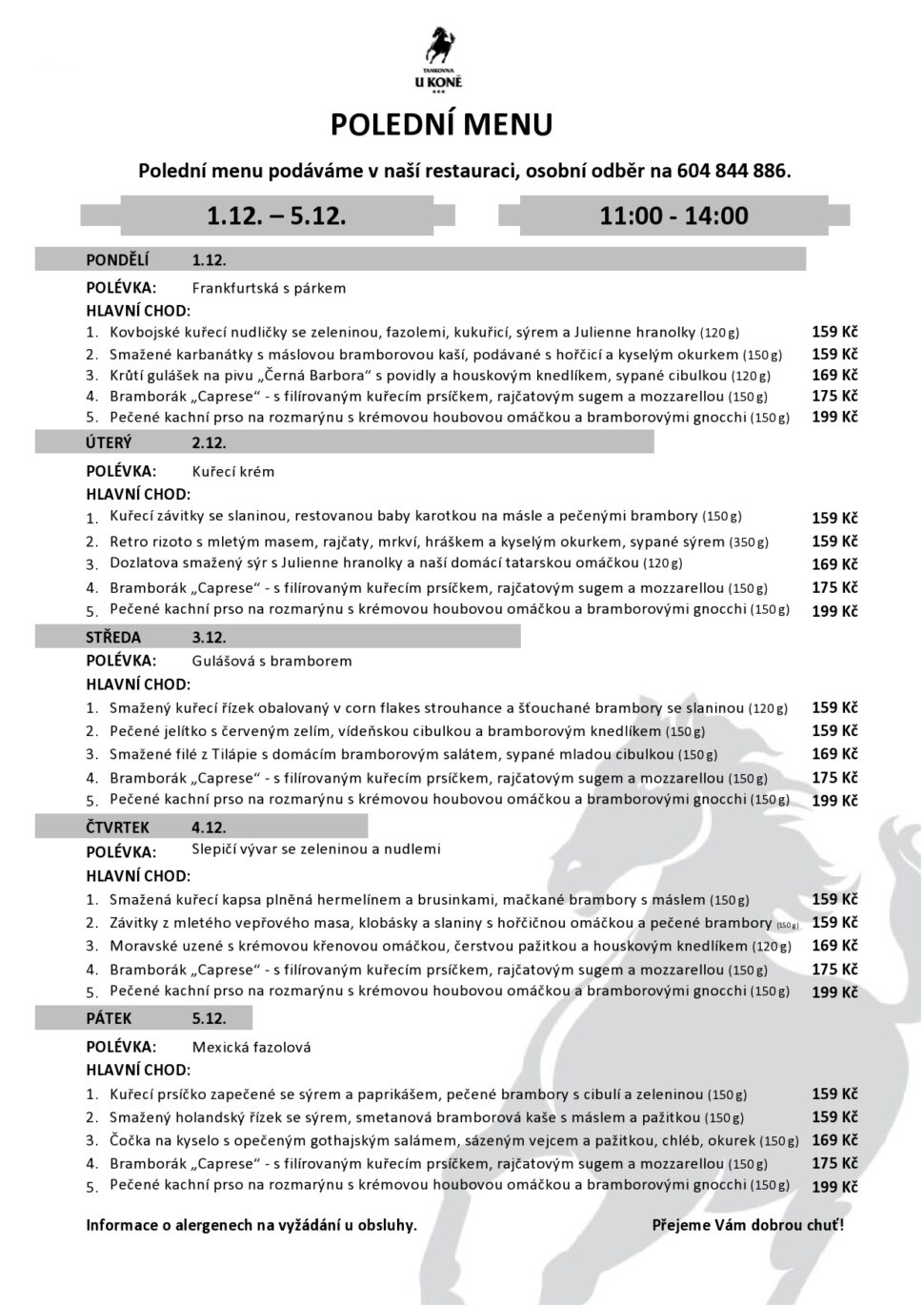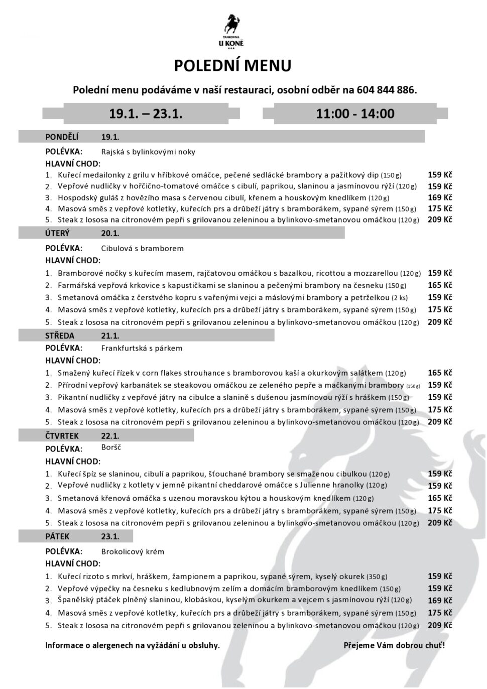 Každý všední den, v době od 11.00 do 14.00, podáváme polední menu. V nabídce si vždy můžete vybrat z 5 hlavních jídel. Níže naleznete menu na aktuální týden. Budeme se těšit na Vaši návštěvu.